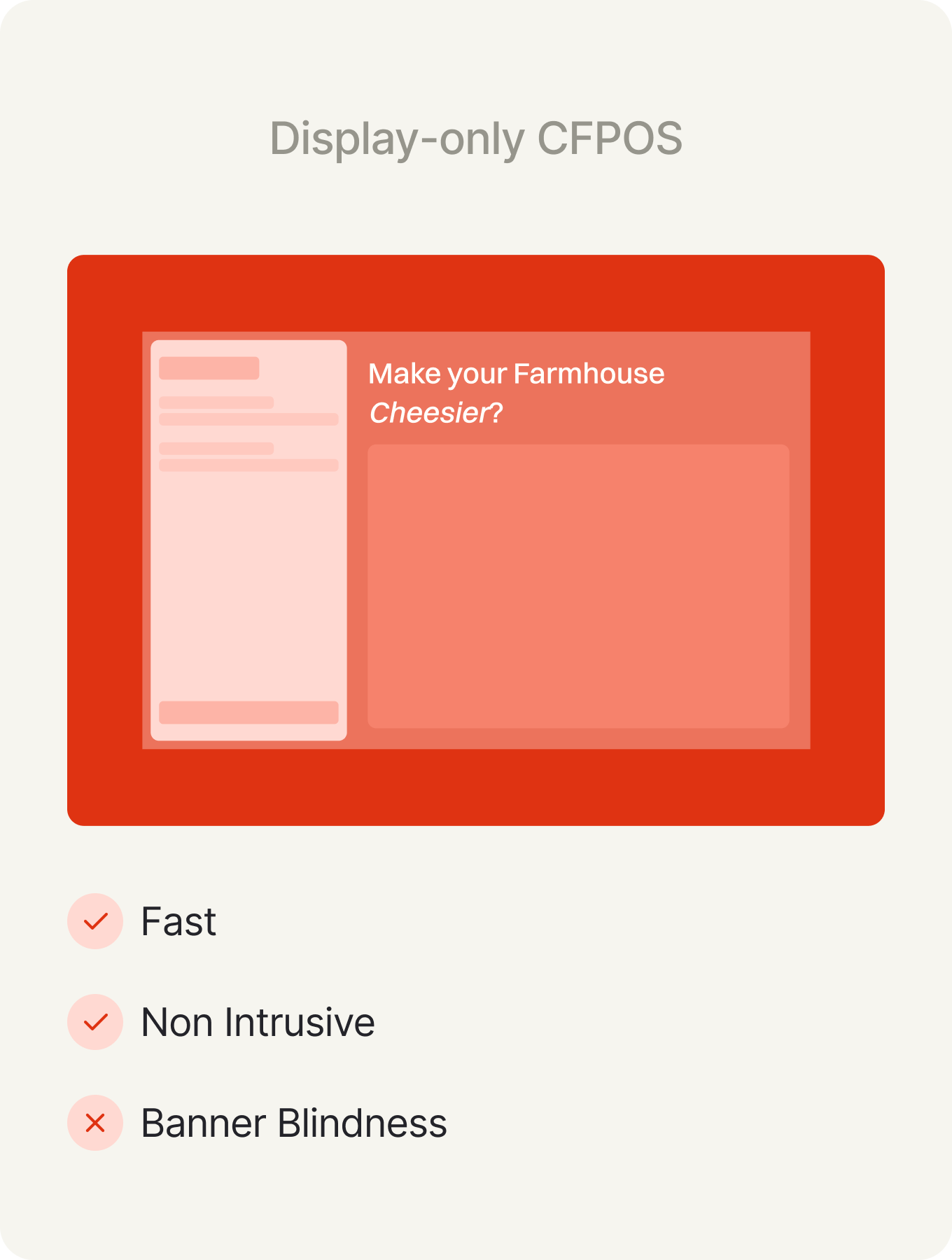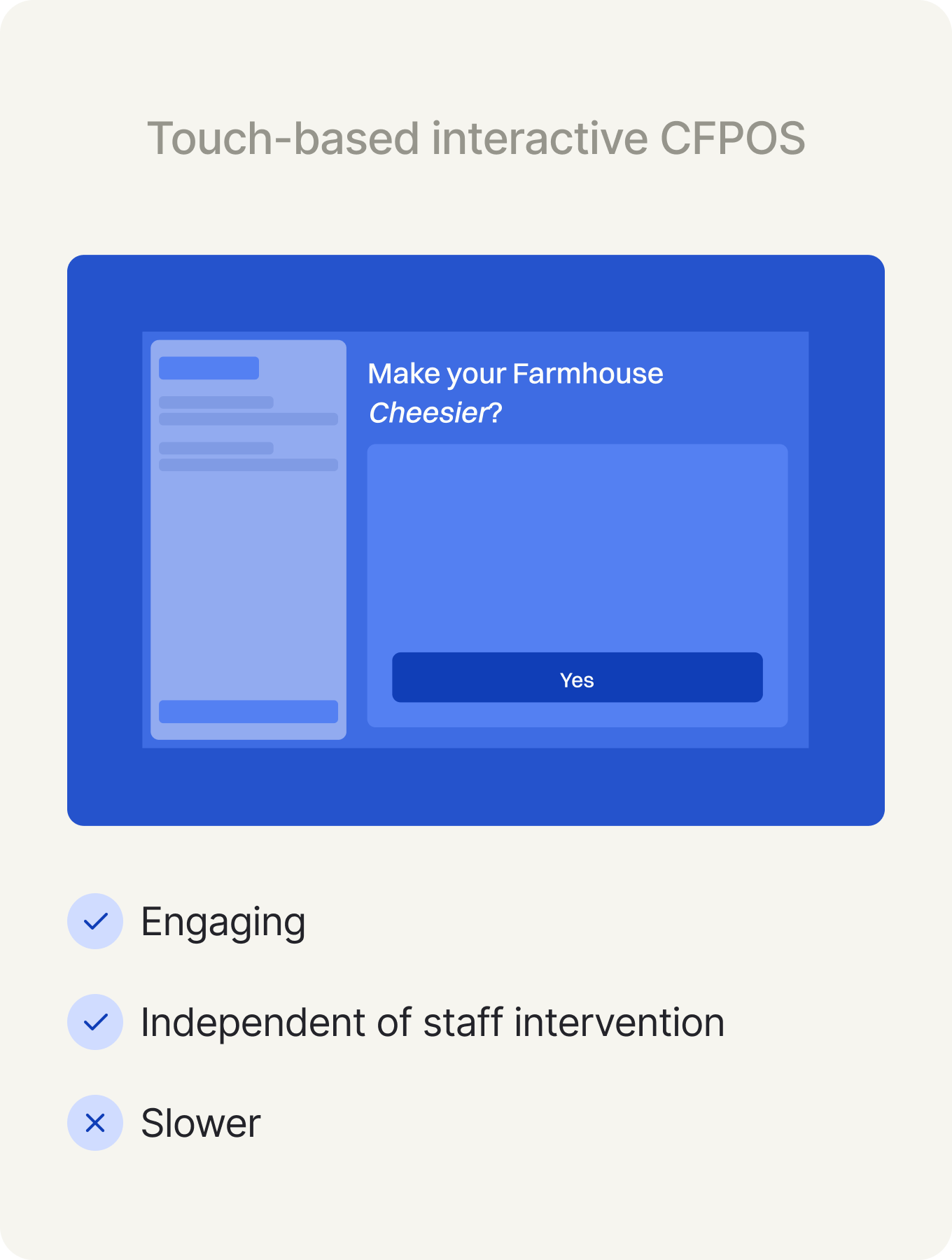 Explored both display-only and touch-enabled experiences. We chose a minimal touch-based CFPOS to move customers from passive viewers to active participants, making upsells self-driven and consistent without increasing staff effort during peak hours.
